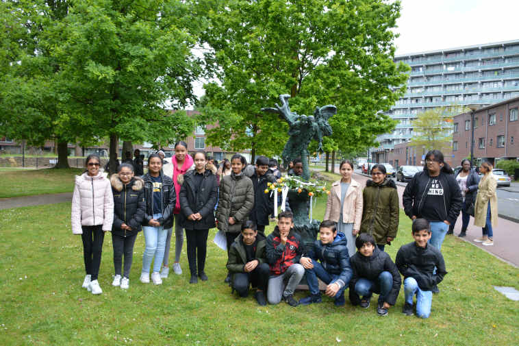 Op vrijdag 10 mei legden alle kinderen een roos met daaraan een regel uit hun eigen gedichten bij het beeld. Ze stonden in een grote cirkel om het beeld met en één voor één zeiden ze hun dichtregel en legden hun roos bij het monument.