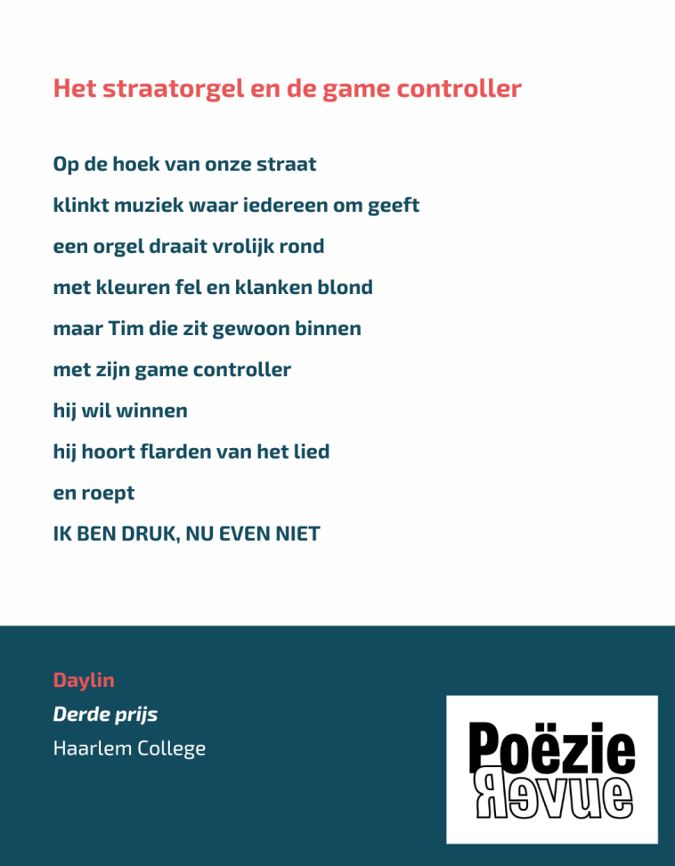 3e prijs Daylin met Het straatorgel en de game controller. Een hedendaags origineel gedicht.