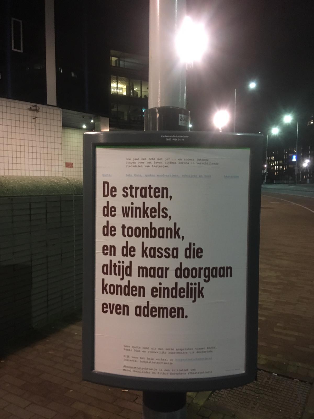 #HoeGaatHetEchtMetJe is een postercampagne door heel Amsterdam. Opgetekend en uitgezet met diverse Amsterdamse communities en community kunstenaars focust de campagne op 'Hoe gaat het echt met je?' en andere intieme vragen over het leven tijdens en na corona in verschillende stadsdelen van Amsterdam.
